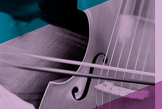 Es ist der mittlere Bereich eines Kontrabass zu sehen, dessen Saiten von einer hand mit Bogen bespielt werden.